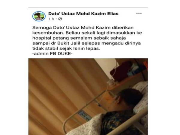 "Semoga Dato’ Ustaz Mohd Kazim diberikan kesembuhan. Beliau sekali lagi dimasukkan ke hospital petang semalam sebaik sahaja sampai dari Bukit Jalil selepas mengadu dirinya tidak stabil sejak Isnin lepas," jelas hantaran Facebook tersebut.
