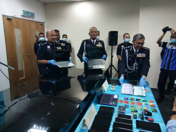 "Kita turut merampas sebanyak 11 telefon bimbit pelbagai jenama, 20 keping kad ATM pelbagai bank, dua keping kad kredit, empat buah tablet, lima buah komputer riba, lima buah kereta mewah serta wang tunai berjumlah RM 109,594," katanya pada sidang akhbar di Ibu Pejabat (JSJK) Bukit Aman di sini pada Jumaat.