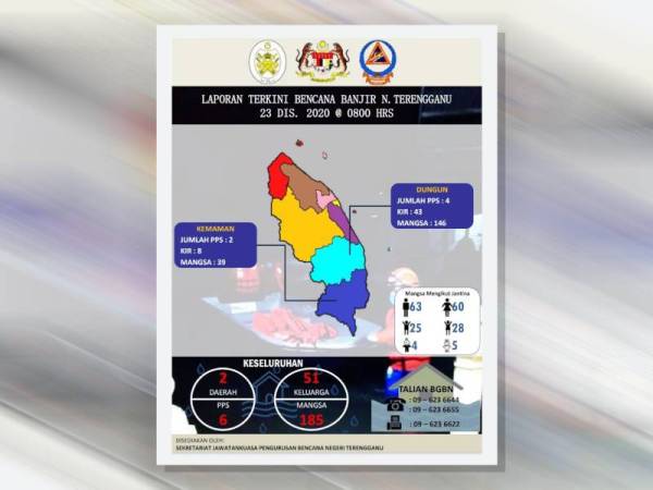 KUALA TERENGGANU - Keadaan banjir di Terengganu semakin pulih dengan jumlah mangsa kini menurun kepada 185 orang.