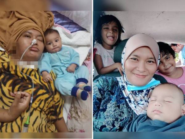 Marihah ketika masih koma dipercayai akibat tekanan darah tinggi dan kencing manis, di samping anaknya yang berusia empat bulan (Kanan: Marihah ketika masih sihat di samping bayi yang baharu dilahirkan sebelum mengalami koma )