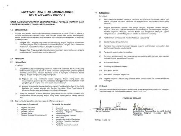Pada Isnin, Khairy dan Menteri Kesihatan, Datuk Seri Dr Adham Baba telah menandatangani dokumen garis panduan itu yang dimuat naik di laman sesawang https://www.vaksincovid.gov.my/, Kementerian Kesihatan serta Kementerian Sains, Teknologi dan Inovasi bagi menjelaskan takrifan barisan hadapan.