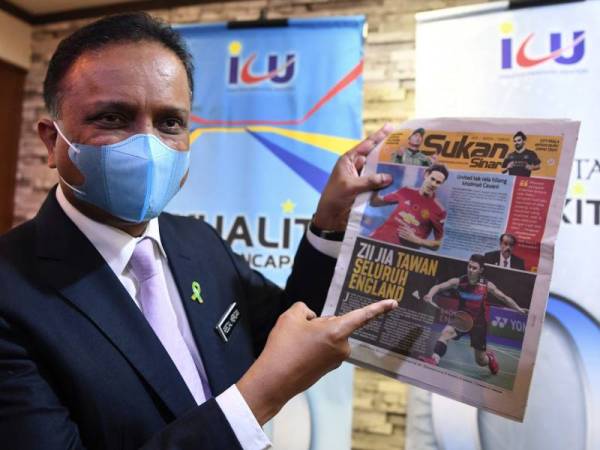 Reezal Merican menunjukkan keratan akhbar Sinar Harian yang memaparkan kejayaan Zii Jia yang melakarkan sejarah tersendiri selepas muncul juara kejohanan All England 2021 di Birmingham, England pada Ahad. - Foto Bernama