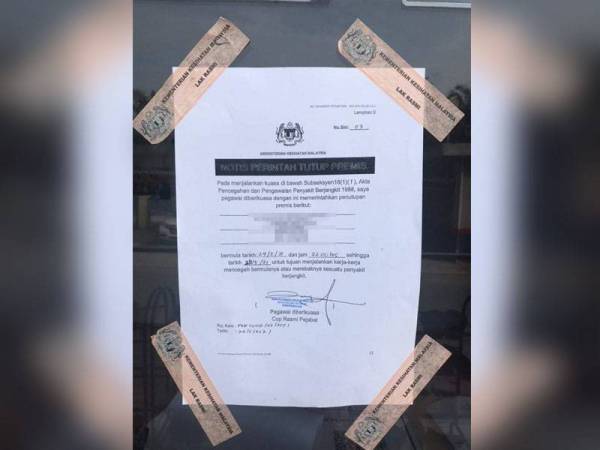 Menerusi notis perintah tutup premis terbabit yang tular di media sosial itu memaklumkan, premis berkenaan ditutup selama empat hari sehingga Jumaat.