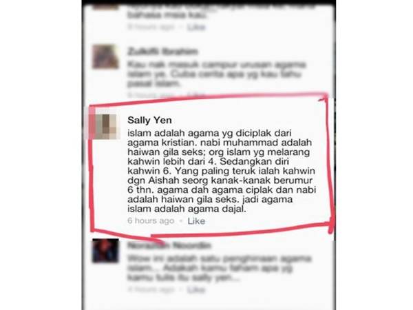 SANDAKAN - Badan Belia Pertubuhan Islam Seluruh Sabah (Belia Usia) Bahagian Sandakan dan Beluran membuat laporan polis terhadap pemilik akaun Facebook menggunakan nama Sally Yen kerana menghina agama Islam di laman sosial berkenaan.