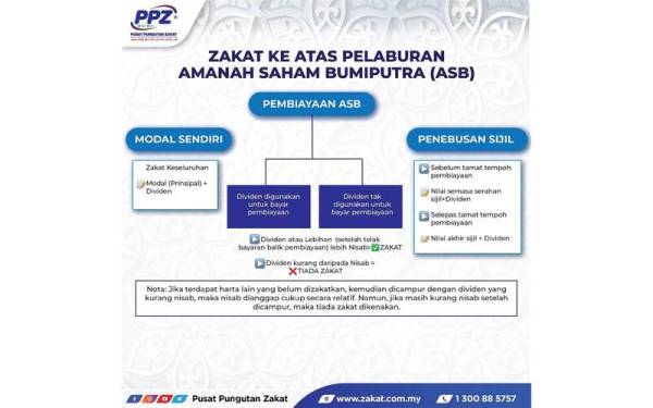 Kita guna model sendiri. Pembayaran zakat perlu dari sudut ‘prinsipal’ dan dividen. Jika kita melabur dalam ASB menggunakan pembiayaan, ia dibahagikan kepada dua kategori iaitu dividen yang diperoleh digunakan untuk membayar pembiayaan dan dividen tidak gunakan bagi tujuan berkenaan.