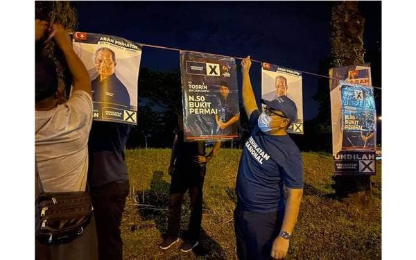 PERSIAPAN...Jentera PN di DUN Larkin bergambar bersama ketika menyiapkan bahan kempen di Bilik Gerakan PN DUN Larkin, Larkin Jaya, Johor Bahru.