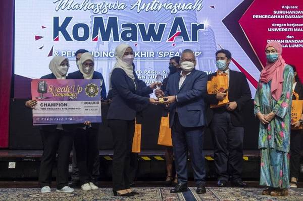 Norazlan menyampaikan trofi pemenang pertandingan 'Speak Up' kepada pelajar Kolej Poly-Tech Mara, Madiha Syahidah Mohd Rohani pada Majlis Konvensyen Mahasiswa Antirasuah dan Pertandingan Akhir 'Speak Up' di Dewan Tunku Canselor Universiti Malaya pada Sabtu. - Foto Bernama