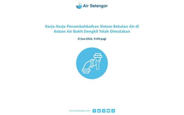 SHAH ALAM - Kerja penambahbaikan sistem bekalan air di Kolam Air Bukit Dengkil dijalankan mengikut jadual ditetapkan pada jam 9 pagi Selasa.