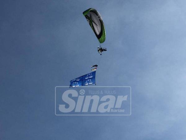 Memasuki hari kelapan kempen, kem BN hari ini menarik perhatian ramai apabila bendera parti itu dibawa mengelilingi Pekan Rantau menggunakan paramotor.