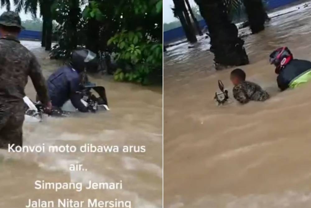MERSING - Sekumpulan konvoi motosikal berkuasa tinggi dari Singapura berdepan detik cemas apabila beberapa motosikal yang dinaiki hampir dihanyutkan banjir di Jalan Nitar, Mersing.