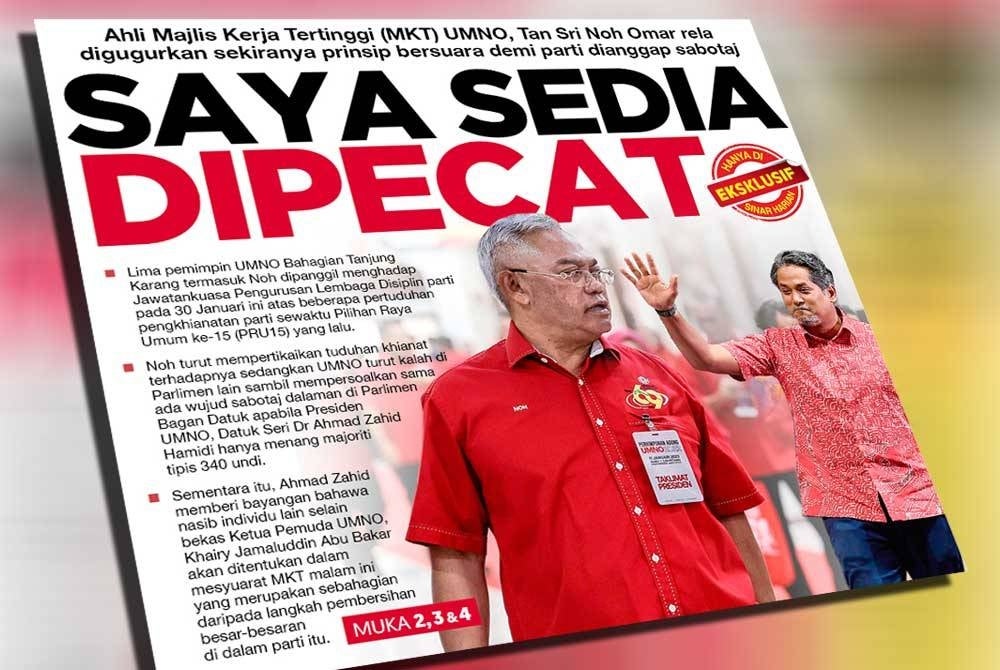 Demikian kenyataan Ahli Majlis Kerja Tertinggi (MKT) UMNO, Tan Sri Noh Omar yang mengesahkan beliau bersama empat pemimpin UMNO Bahagian Tanjung Karang termasuk anaknya sendiri, telah diberi notis panggilan untuk menghadap Jawatankasa Pengurusan Lembaga Disiplin UMNO pada 30 Januari ini.