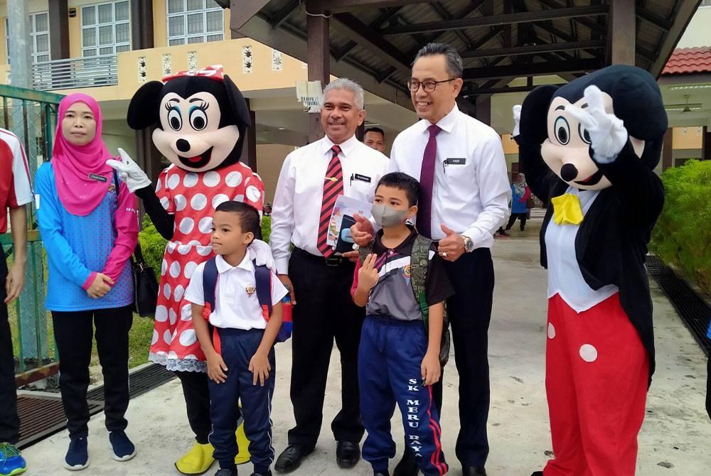 IPOH - Hari pertama sesi persekolahan di Sekolah Kebangsaan (SK) Meru Raya di sini nyata memberi keterujaan buat muridnya apabila mereka disambut figura kartun Bumblebee, Mickey Mouse dan Minnie Mouse.