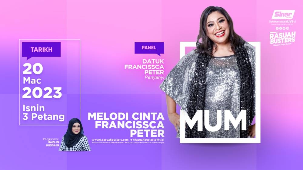 Ikuti perkongsian penyanyi lagenda tanah air bernama Datuk Francissca Peter dalam program MUM pada HARI INI, jam 3 petang hanya di seluruh platform digital Sinar Harian.