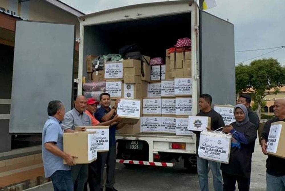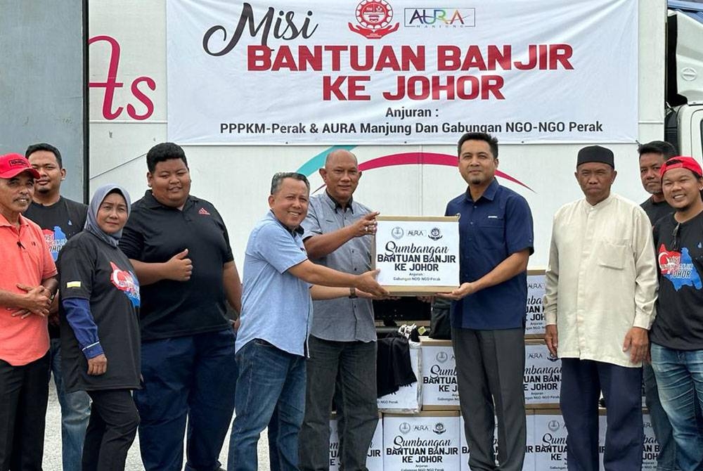 MANJUNG - Persatuan Penjaja dan Peniaga Kecil Melayu (PPPKM) Negeri Perak bersama beberapa pertubuhan bukan kerajaan (NGO) mengumpul pelbagai keperluan lebih tiga tan untuk diserahkan kepada mangsa banjir di Batu Pahat, Johor.
