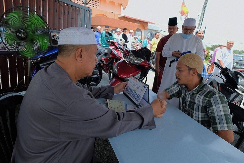 Amil Zakat Selangor Mohd Khairi Mustafa Kamal (kiri) menerima bayaran zakat fitrah daripada jemaah masjid selepas menunaikan solat Jumaat pada hari kedua Ramadan ketika tinjauan di Masjid An-Naim Kampung Jalan Kebun Seksyen 30, Shah Alam hari ini.