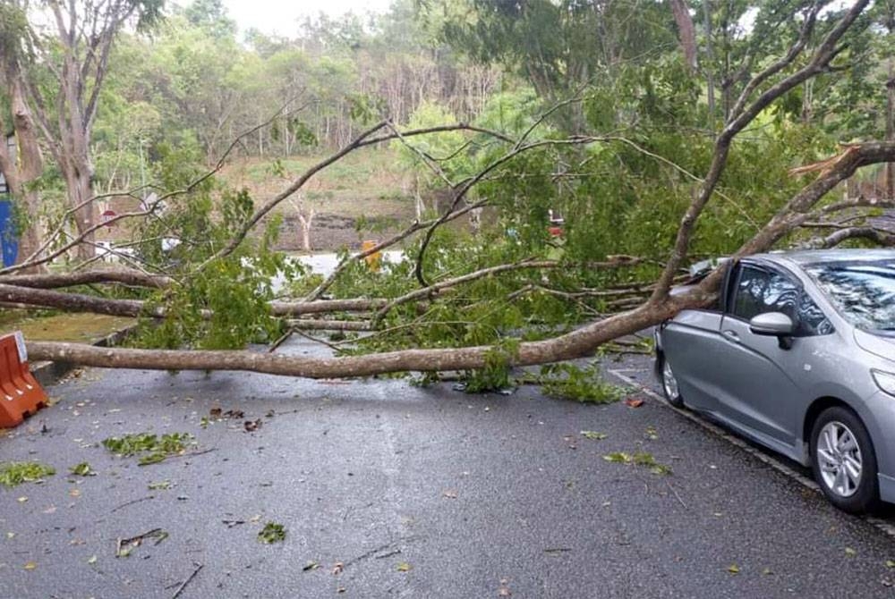 SINTOK - Ribut dan hujan lebat melanda mengakibatkan banyak pokok tumbang hingga menghempap kereta di kampus Universiti Utara Malaysia (UUM), di sini pada Rabu.
