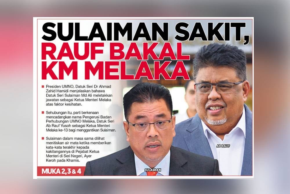 KUALA LUMPUR - UMNO mencadangkan nama Pengerusi Badan Perhubungan UMNO Melaka, Datuk Seri Ab Rauf Yusoh sebagai Ketua Menteri Melaka yang baharu.