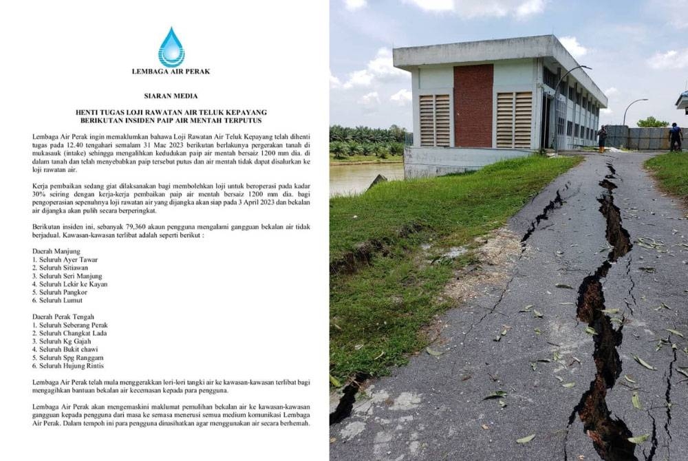 Menurut kenyataan Lembaga Air Perak (LAP), Loji Rawatan Air di Teluk Kepayang, Bota telah menghentikan penyaluran air sejak jam 12.40 tengah hari berikutan berlakunya pergerakan tanah di muka sauk (intake).