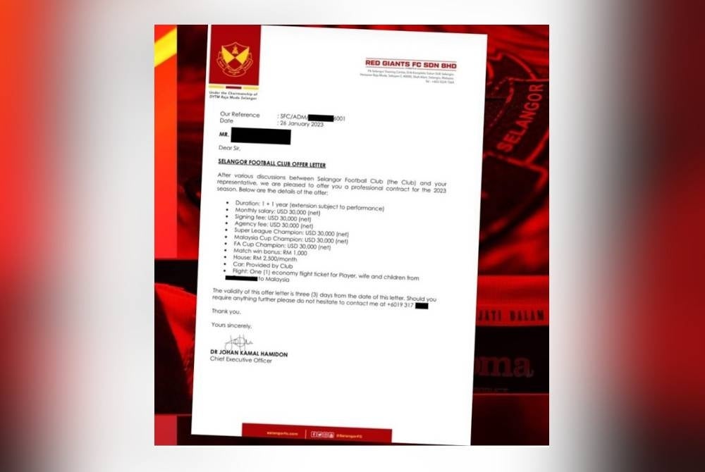 Sebuah laman Facebook Harimau Selatan X mendedahkan surat tawaran kontrak Selangor FC tersebut bertarikh 26 Januari lalu yang turut ditandatangani oleh Ketua Pegawai Eksekutif Selangor FC, Dr Johan Kamal Hamidon.