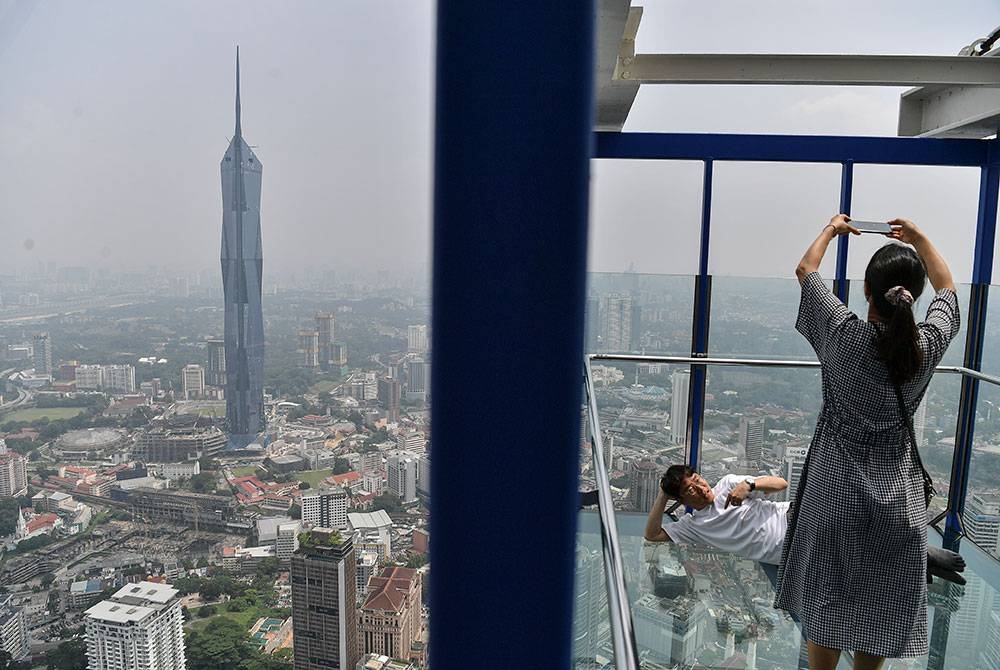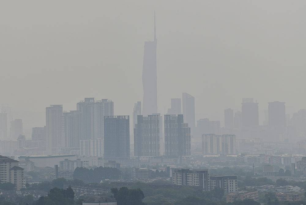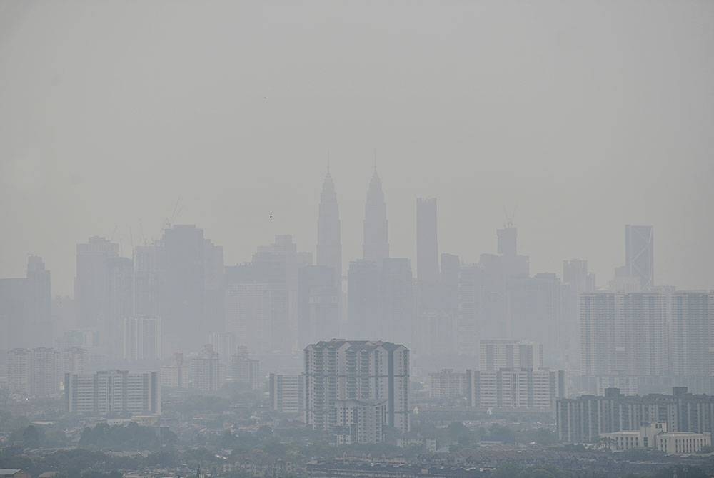 Pemandangan bangunan pencakar langit Menara KLCC (tengah) dan sekitarnya kelihatan kabur berikutan keadaan jerebu yang melanda ketika tinjauan foto Bernama di pusat bandar hari ini.