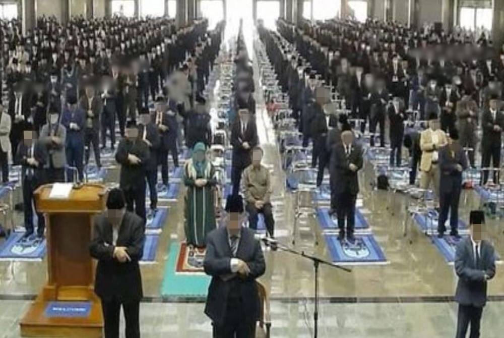 Dalam video tersebut kelihatan mereka melaksanakan solat berjarak seperti semasa pandemik Covid-19 tetapi bercampur antara lelaki dan wanita dalam satu saf