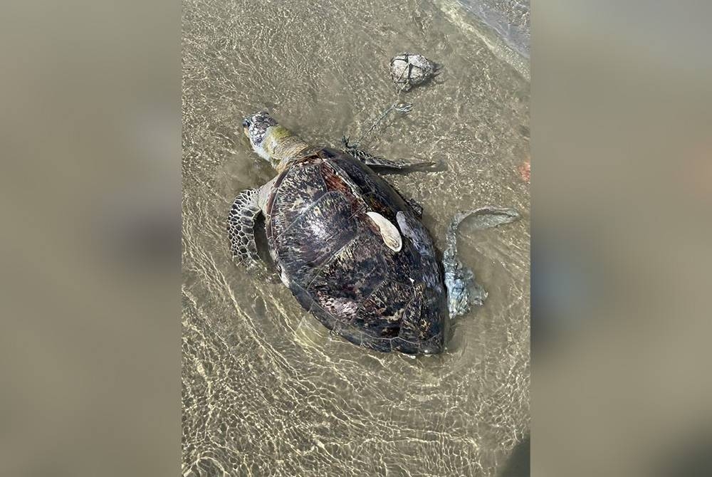KUALA TERENGGANU - Seorang wanita terkejut apabila menemukan bangkai seekor penyu dalam keadaan kaki pendayung sebelah kanan terikat pada batu di Pantai Pandak Chendering, di sini pada petang Ahad.
