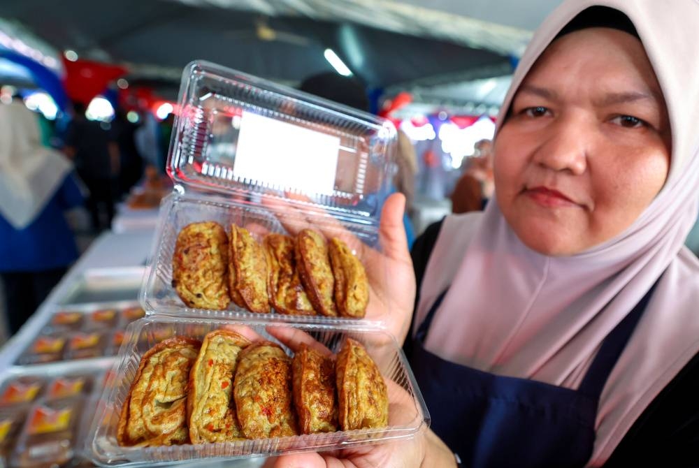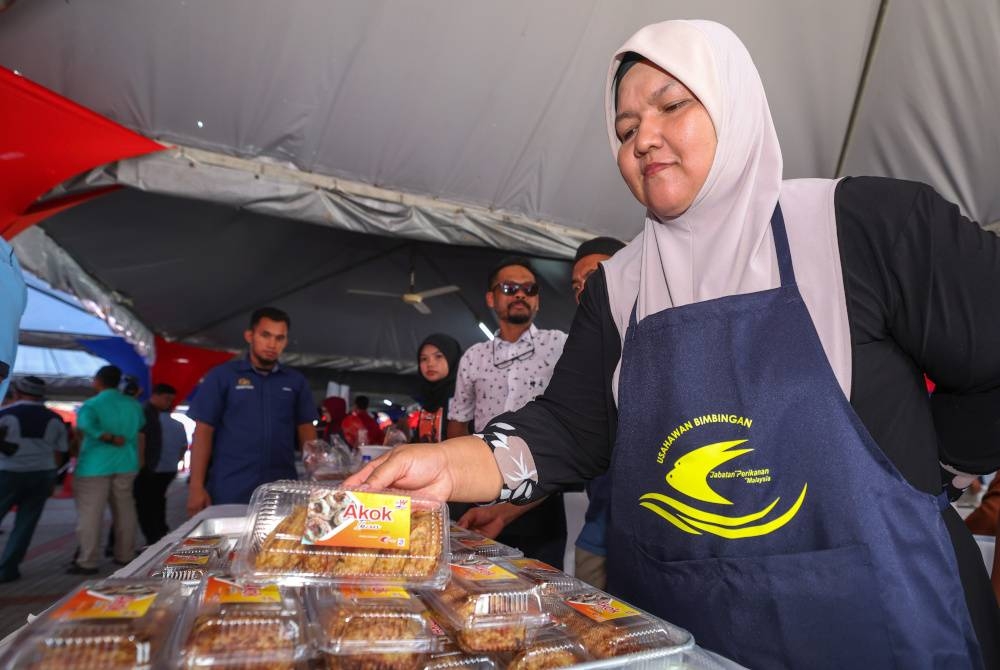 Pengusaha kuih Akok Ikan dari Kampung Chalil, Gua Musang Zaharah Mohd Nor, 43, menunjukkan kuih akok ikan di gerai jualannya ketika ditemui pemberita di Program Karnival Usahawan myAgropreneur Perikanan (myAP) & myKOMUNITI Perikanan (myKP) Zon Timur Tahun 2023 di Dataran Bahtera Tok Bali.