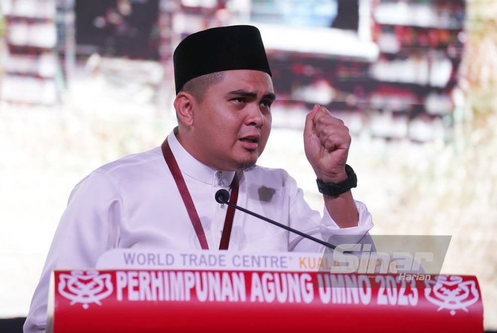 Dr Muhamad Akmal semasa ucapan dasar sempena Perhimpunan Agung Pemuda UMNO 2023 yang berlangsung di Pusat Dagangan Dunia di sini, pada Khamis. - Foto Sinar Harian/ Rosli Talib