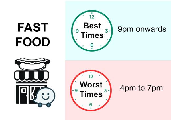 Inginkan snek lewat malam ataupun sarapan awal pagi di restoran makanan segera kegemaran anda tanpa perlu bersesak? Itu semua tidak menjadi masalah jika anda merancang perjalanan dan menurut kajian pihak Waze, selepas jam 9 malam merupakan waktu yang sesuai untuk berkunjung ke restoran makanan segera, terutamanya jam 12 tengah malam hingga 5 pagi.