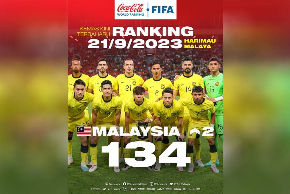[DIKEMAS KINI] PASUKAN Harimau Malaya terus memperbaiki ranking untuk berada di kedudukan ke-134 dunia dalam kemas kini terbaharu Persekutuan Bola Sepak Antarabangsa (FIFA) pada Khamis.