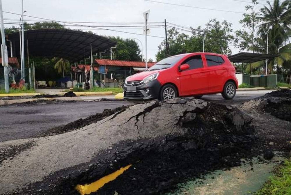 Gambar yang dipaparkan juga menunjukkan keadaan jalan berturap mulai pecah dan menyukarkan pengguna jalan raya yang melalui laluan berkenaan.