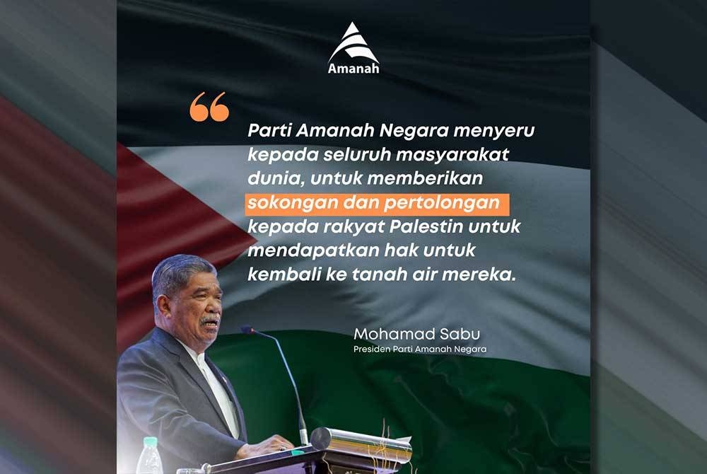 KUALA LUMPUR - Presiden Parti Amanah Negara (Amanah), Datuk Seri Mohamad Sabu menyeru seluruh masyarakat antarabangsa memberikan sokongan dan pertolongan kepada rakyat Palestin untuk mendapatkan hak kembali ke tanah air mereka.