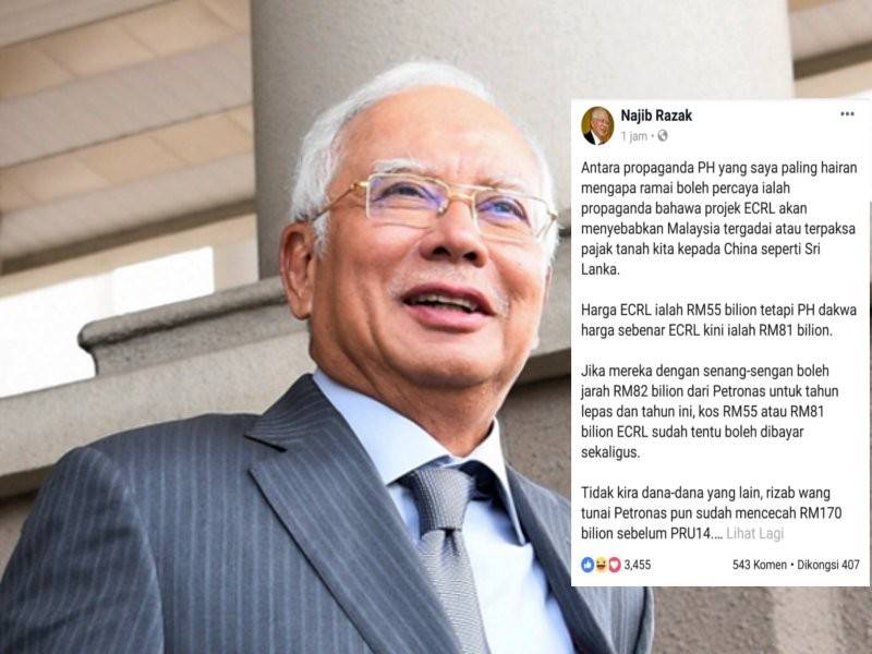 Dalam pada itu, Najib yang juga bekas Menteri Kewangan mempersoalkan asas digunakan kerajaan hari ini hingga projek ECRL itu dikatakan boleh menyebabkan Malaysia tergadai atau terpaksa memajak tanah kepada China seperti dilakukan Sri Lanka.