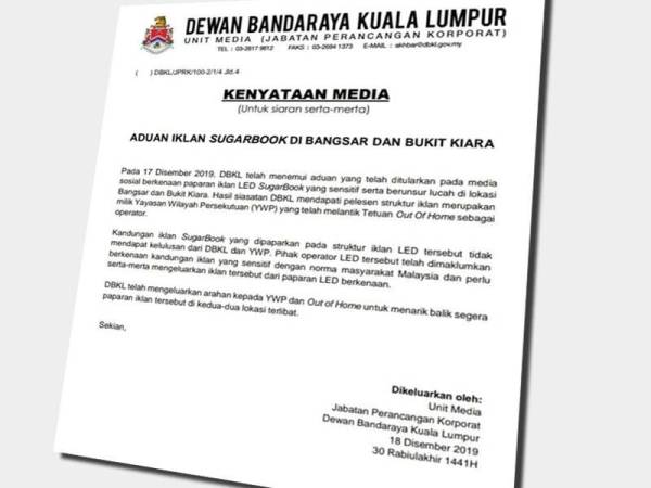 KUALA LUMPUR - Dewan Bandaraya Kuala Lumpur (DBKL) telah mengarahkan struktur papan iklan luar LED Sugarbook di Bangsar dan Bukit Kiara ditarik serta- merta.