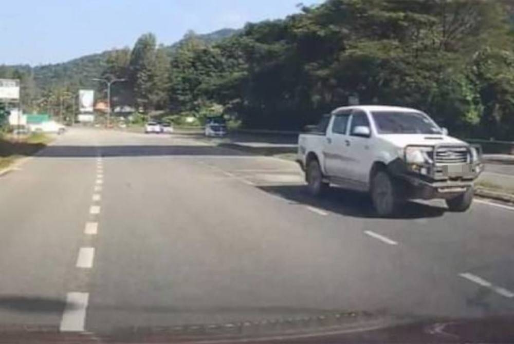 Toyota Hilux berkenaan yang menggunakan laluan bertentangan mengakibatkan kenderaan yang menggunakan laluan terbabit terpaksa mengelak daripada bertembung.