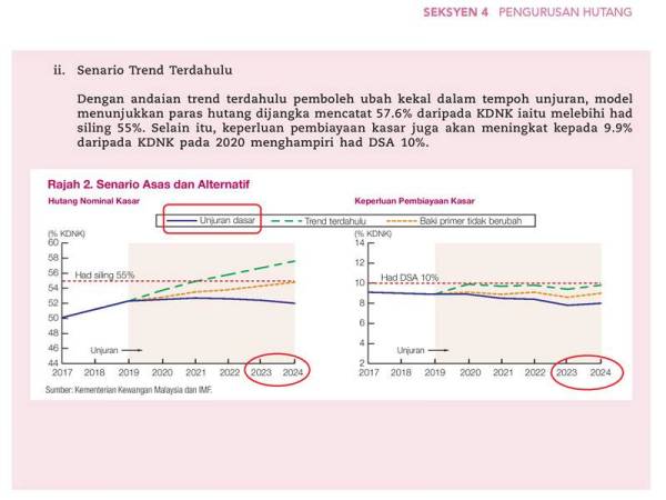 "Kini defisit dan nisbah sudah dinaikkan oleh PH dan dirancang untuk terus tinggi pula. Laporan juga kata kalau trend hutang naik pada tahun 2018 dan 2019 di bawah PH diteruskan, maka hutang langsung negara akan cecah had undang-undang 55 peratus pada tahun 2021," tulisnya.