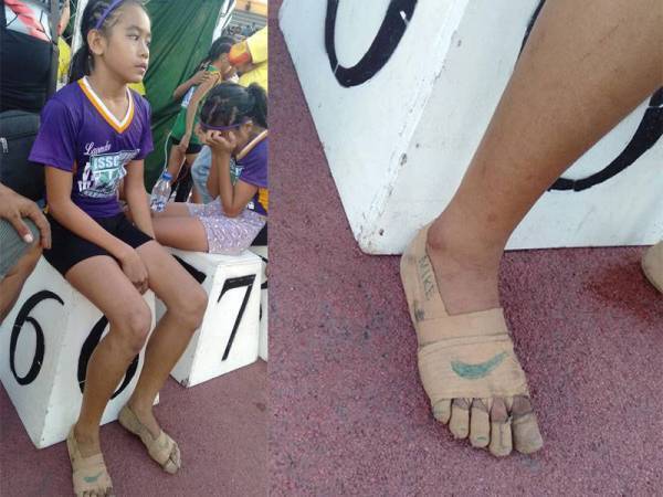 FILIPINA - Walaupun tidak memiliki kasut sukan dan hanya membalut jari kakinya menggunakan plaster, ia tidak mematahkan semangat seorang atlet Filipina yang telah memenangi tiga pingat emas dalam acara larian.