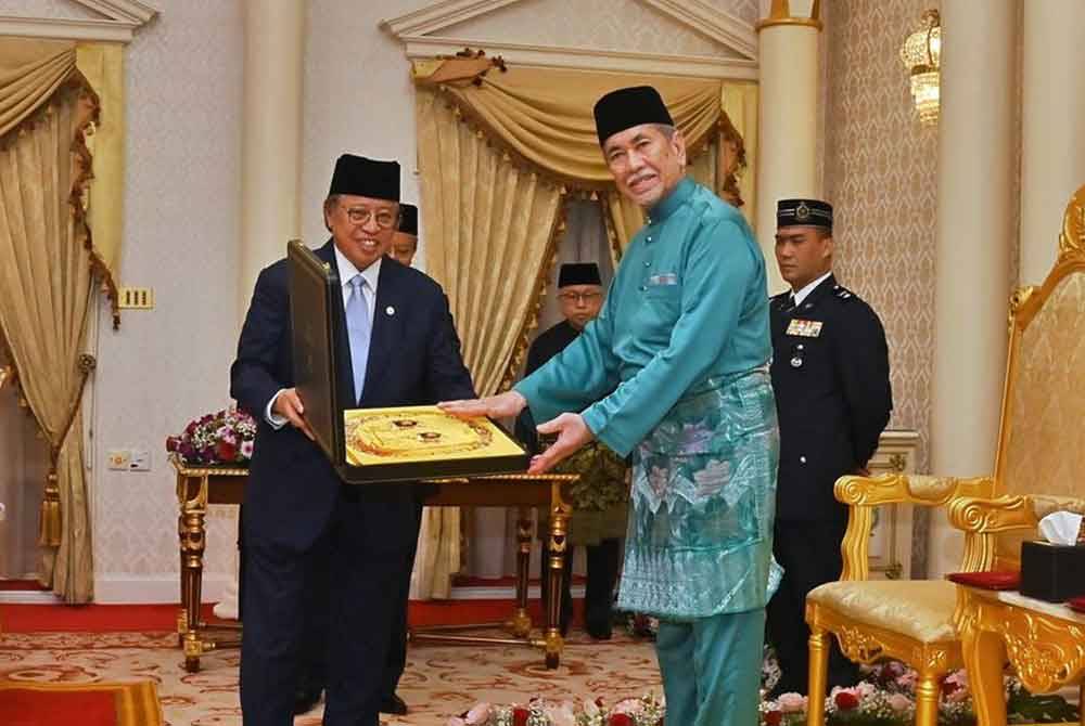 KUCHING - Yang di-Pertua Negeri Sarawak, Tun Dr Wan Junaidi Tuanku Jaafar menerima anugerah Darjah Satria Bintang Sarawak (SBS) yang membawa gelaran Pehin Sri.