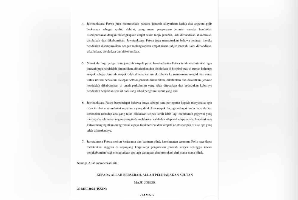"Bagi pengurusan jenazah suspek pula, Jawatankuasa Fatwa telah memutuskan agar jenazah hendaklah dimandikan, dikafankan dan disolatkan di hospital atau di rumah keluarga suspek sahaja.