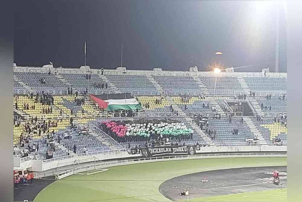 KUALA NERUS - Penyokong Terengganu FC (TFC) menunjukkan tanda solidariti terhadap Palestin dengan mengibarkan bendera negara itu semasa perlawanan Liga Super 2024/2025 menentang Kelantan Darul Naim FC (KDNFC) di Stadium Sultan Mizan Zainal Abidin, Gong Badak pada Jumaat.