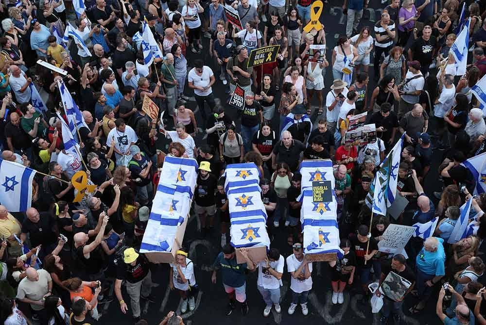 TEL AVIV - Disifatkan sebagai "lautan tunjuk perasaan tidak berkesudahan," kemarahan rakyat Israel yang sukar dibendung diterjemahkan dalam demonstrasi besar-besaran, di sini, yang disertai sekurang-kurangnya 700,000 orang pada Ahad malam, selepas tentera Israel menemui mayat enam tebusan yang dibunuh oleh Hamas di Gaza.