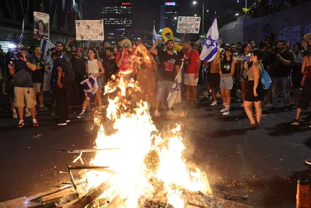 Ratusan ribu menyekat jalan raya di Tel Aviv dan berdemonstrasi di luar pejabat Netanyahu di Baitulmaqdis Barat.
