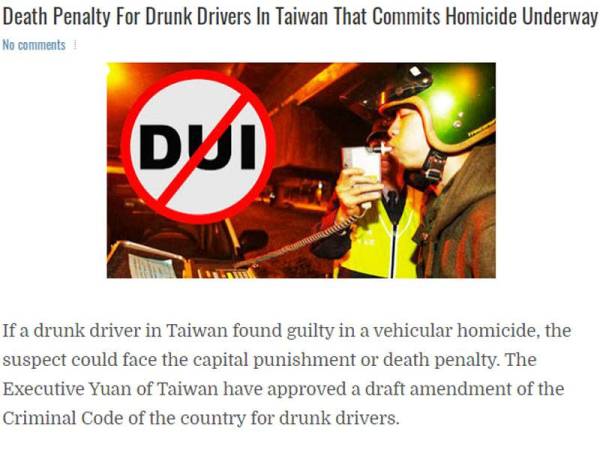 Taiwan misalnya pada Mac tahun lepas merancang untuk melaksanakan hukuman mati terhadap pesalah yang menyebabkan kemalangan maut ketika memandu dalam keadaan mabuk. Berdasarkan laporan pesalah mabuk sebelum ini boleh dikenakan hukuman penjara hingga 10 tahun di Taiwan.