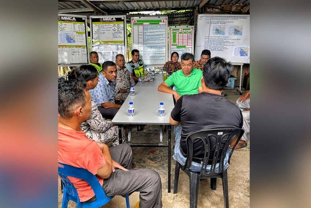 Mohd Noor Helmy dan Abdul Razak (tengah) ketilka mendapatkan maklumat terkini berkenaan operasi itu di PHC Jeti Nelayan Padang Temu, di sini, pada petang Ahad.
