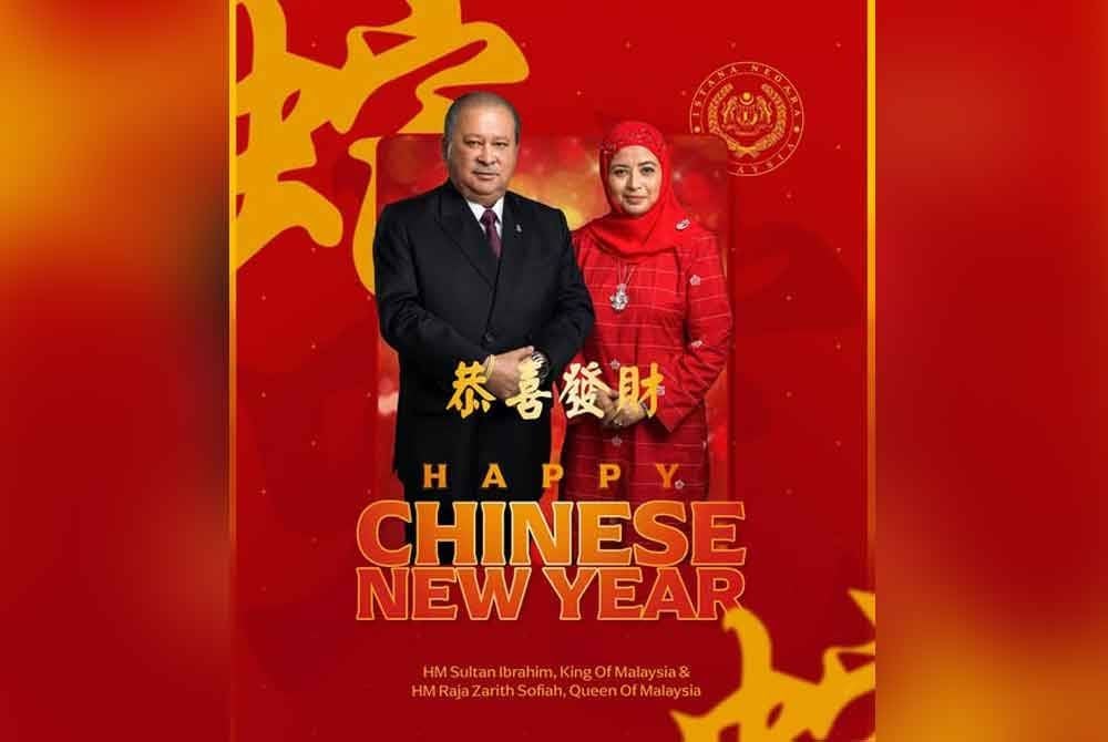 KUALA LUMPUR - Yang di-Pertuan Agong, Sultan Ibrahim dan Raja Permaisuri Agong, Raja Zarith Sofiah menzahirkan ucapan selamat menyambut Tahun Baharu Cina kepada rakyat Malaysia yang menyambut perayaan berkenaan.