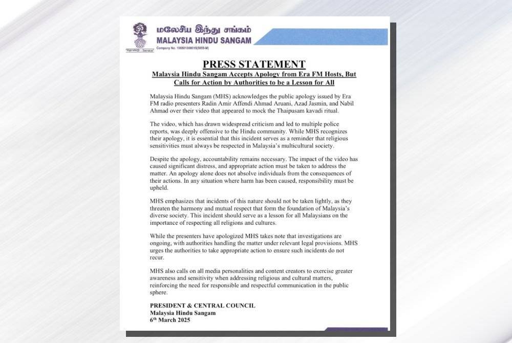 SHAH ALAM - Malaysia Hindu Sangam (MHS) menerima permohonan maaf tiga penyampai radio Era FM berhubung video yang dikatakan mempersenda upacara Thaipusam kavadi hingga mencetuskan pelbagai kontroversi.