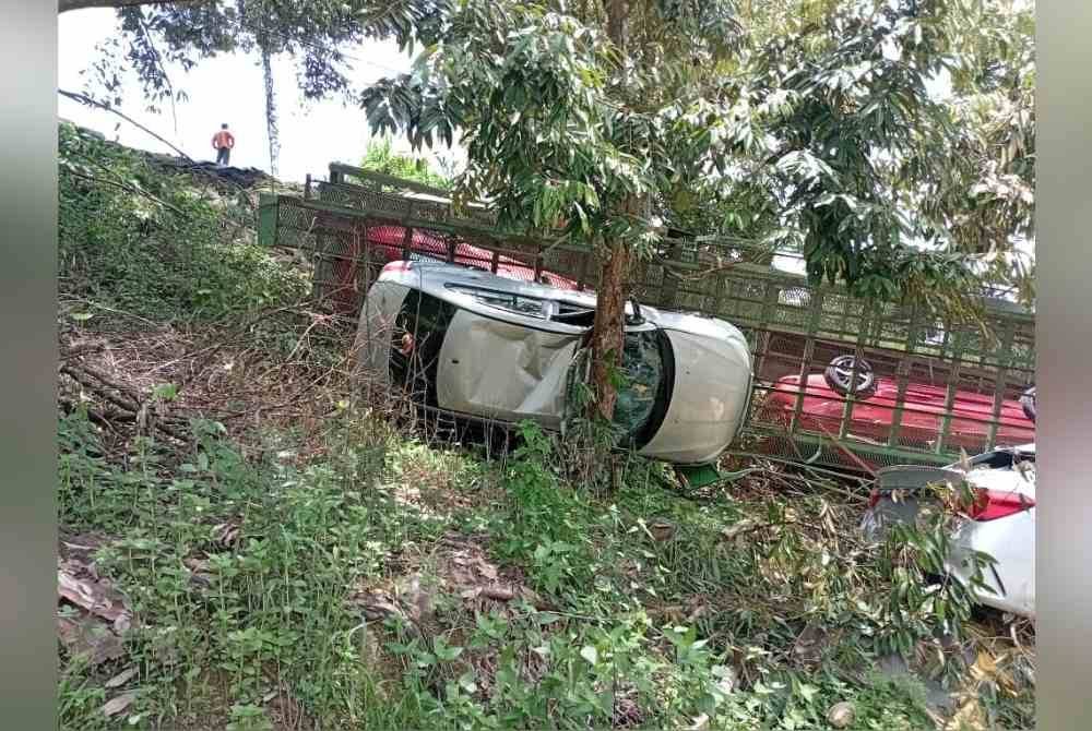 RANAU – Tujuh kereta baharu rosak selepas treler yang mengangkut kenderaan tersebut terbabas dan terjunam ke dalam gaung di Jalan Ranau-Sandakan, Kampung Nobutan, di sini, pada Jumaat.