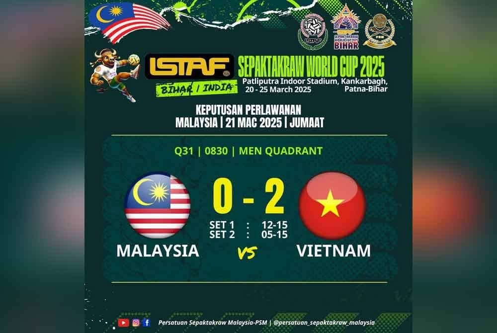 IMPIAN skuad sepak takraw lelaki Malaysia untuk melangkah lebih jauh dalam acara kuadran Kejohanan Piala Dunia Sepak Takraw 2025 tidak kesampaian selepas gagal melepasi peringkat Kumpulan B apabila kalah di tangan Vietnam di Bihar, India pada Jumaat.