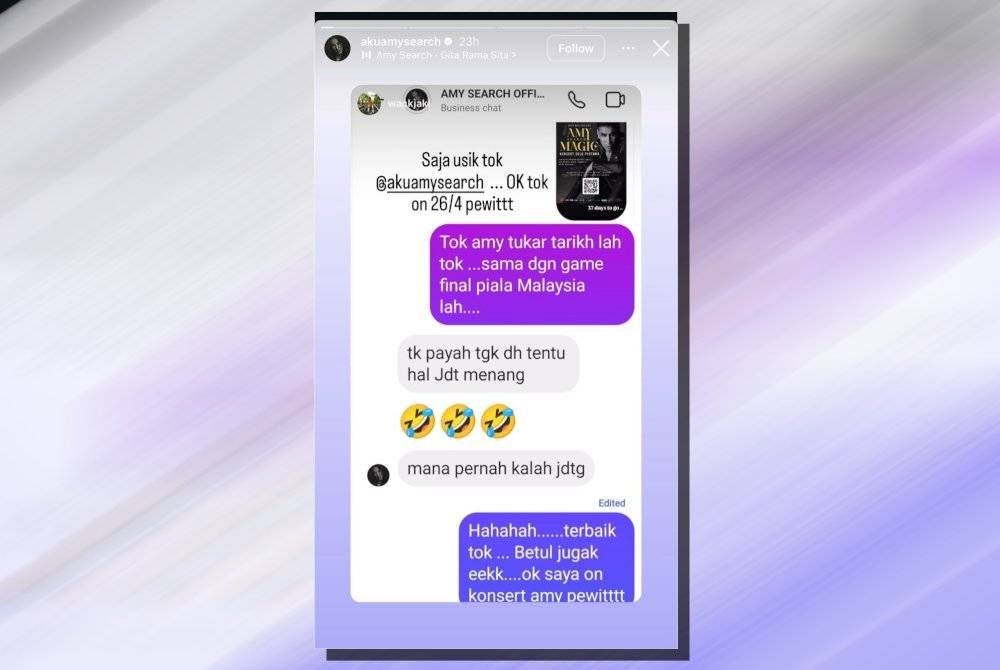 Amy Search respons tarikh konsert bertembung final Piala Malaysia