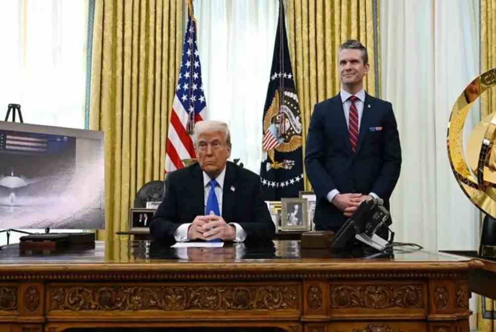 Setiausaha Pertahanan AS, Pete Hegseth bercakap di sebelah Presiden Donald Trump, di Pejabat Oval di Rumah Putih, di Washington, DC. - Foto AFP
